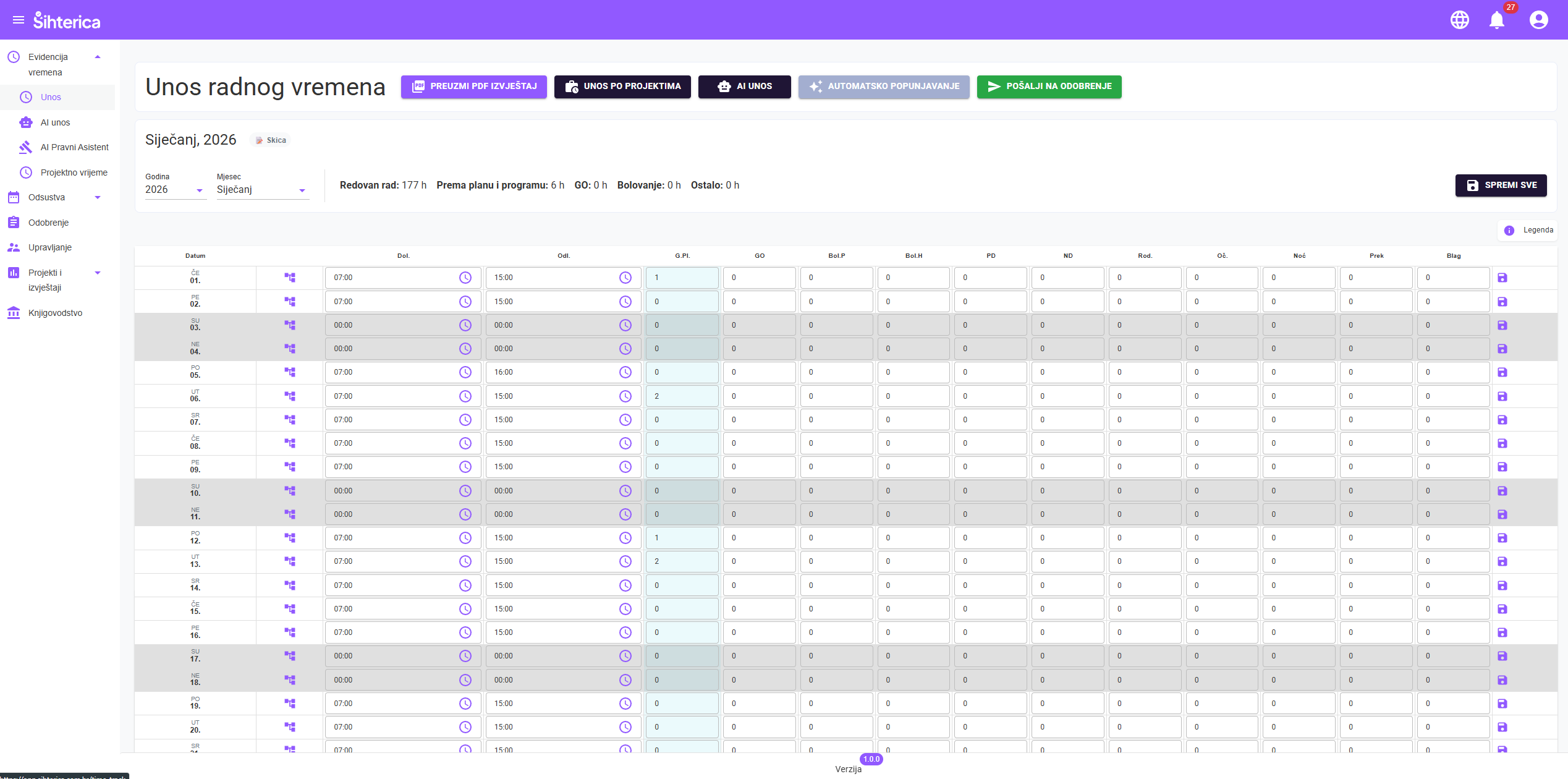 Ako radite standardno radno vrijeme, ne morate ništa upisivati! Kliknite gumb za automatsko popunjavanje i cijeli mjesec će se ispuniti vašim zadanim satima. Zatim samo pregledajte, ispravite dane kad je bilo drugačije i pošaljite na odobravanje.