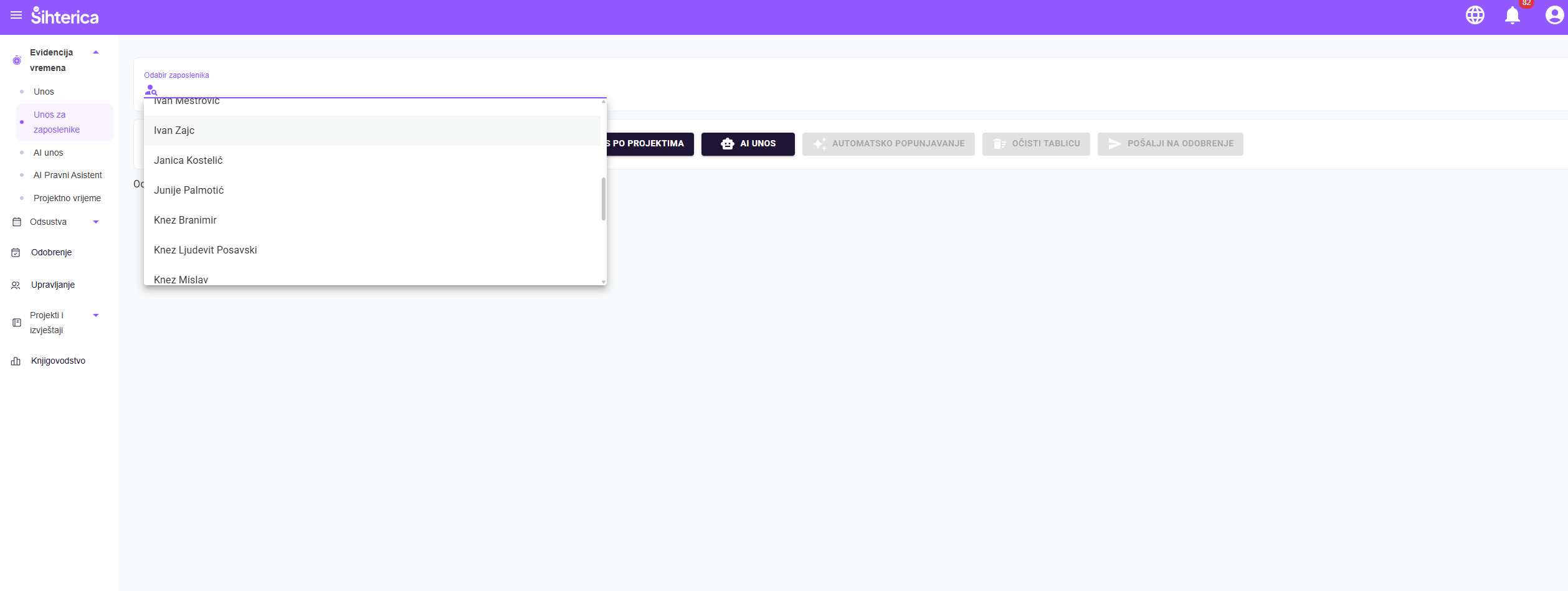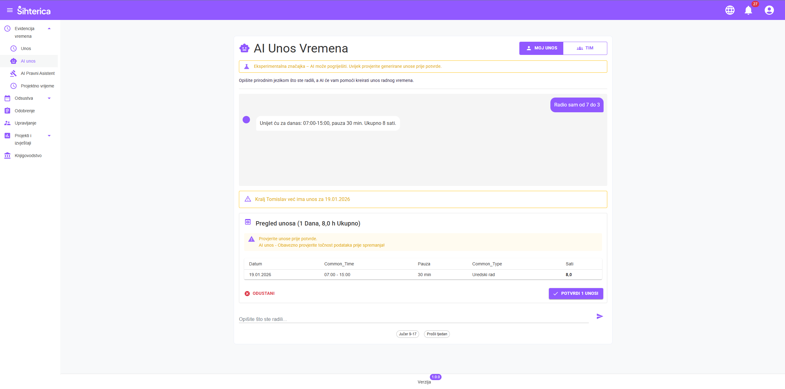 Zaboravite komplicirana sučelja! Jednostavno napišite prirodnim jezikom, npr. "Radio sam od 8 do 16 s pauzom od pola sata" – naš AI će automatski prepoznati i unijeti podatke umjesto vas.