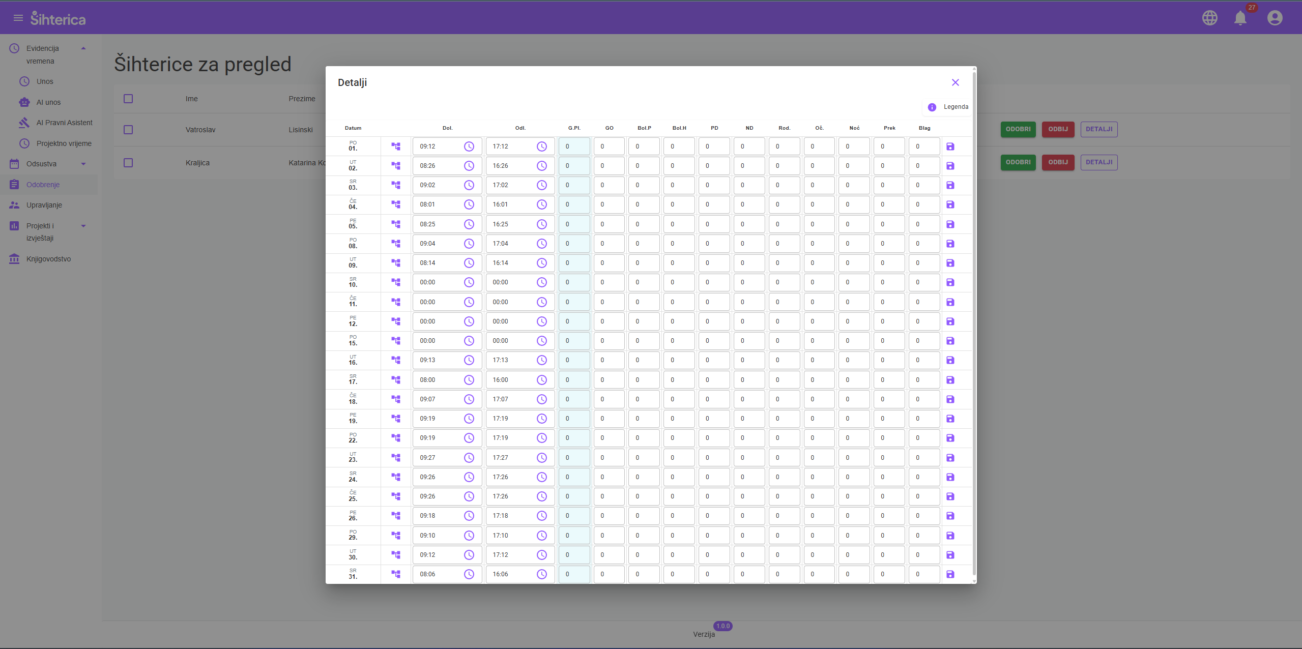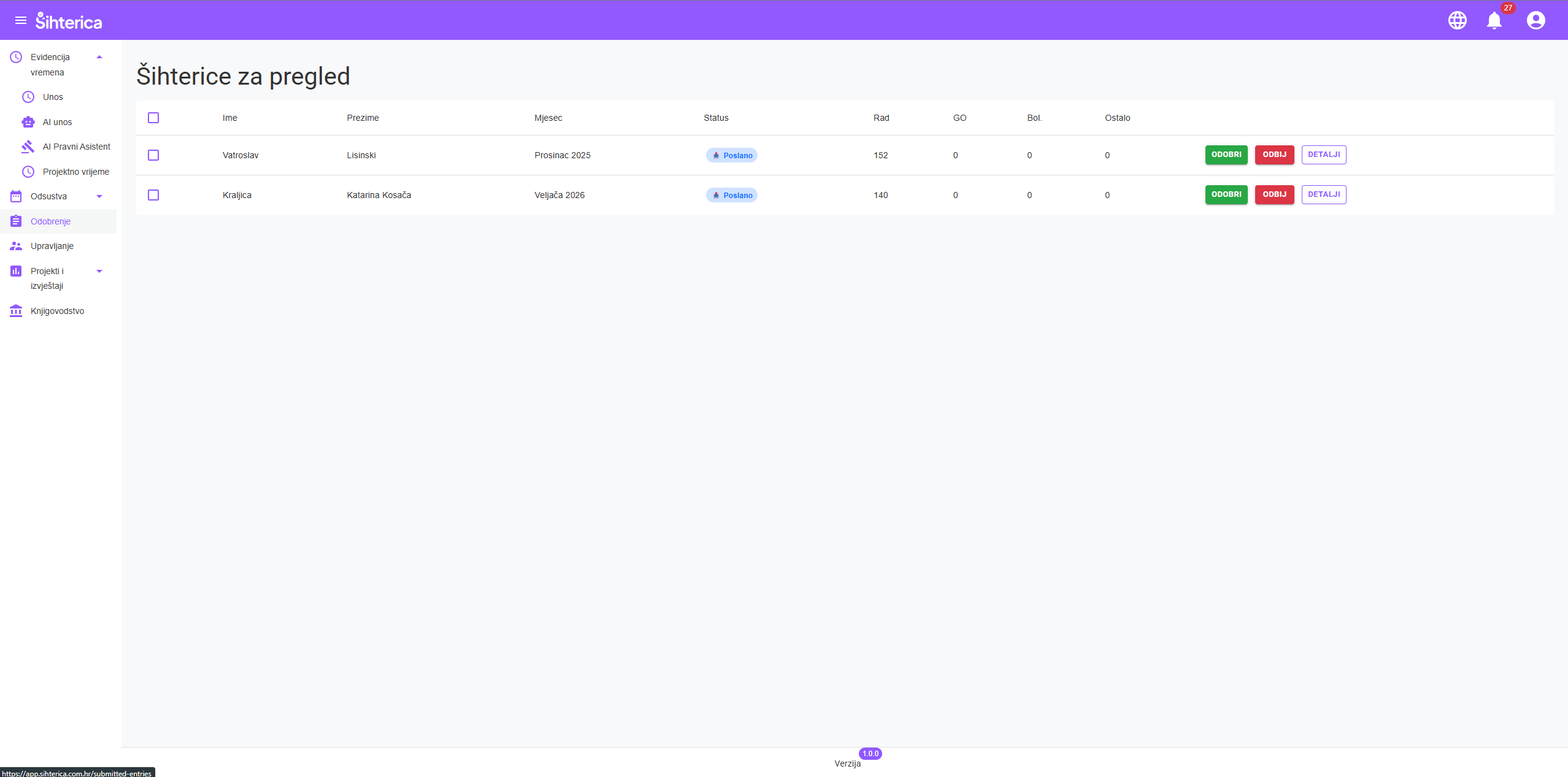 Pregledajte sve radne sate poslane na odobravanje. Odobrite točne unose, sami napravite ispravke ili odbijte i zatražite od zaposlenika da ispravi podatke.