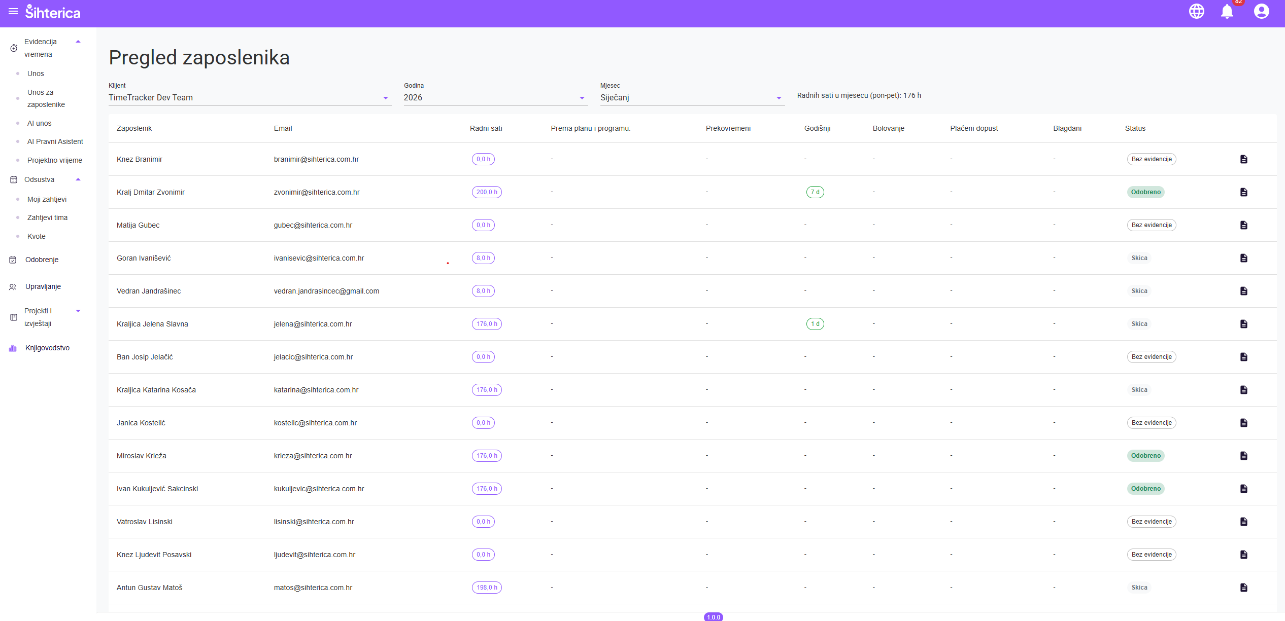 Na profilu postavite svoje zadano radno vrijeme (npr. 8:00-16:00). Sustav će na početku svakog mjeseca automatski popuniti cijeli mjesec s vašim standardnim satima – vi samo provjerite i pošaljite na odobravanje!