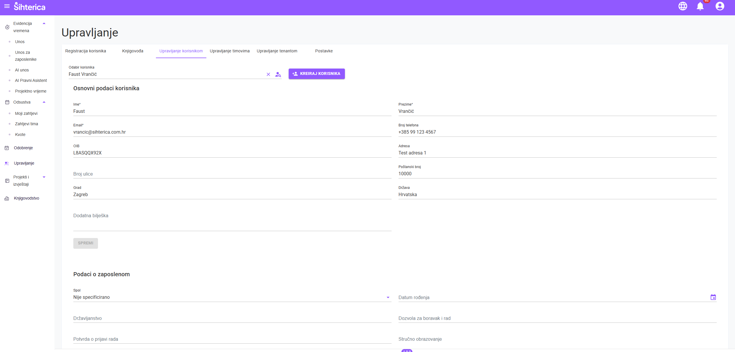 Detaljan uvid u evidencije odabranog zaposlenika. Možete pregledati, unijeti nove podatke ili ispraviti postojeće unose u ime zaposlenika.