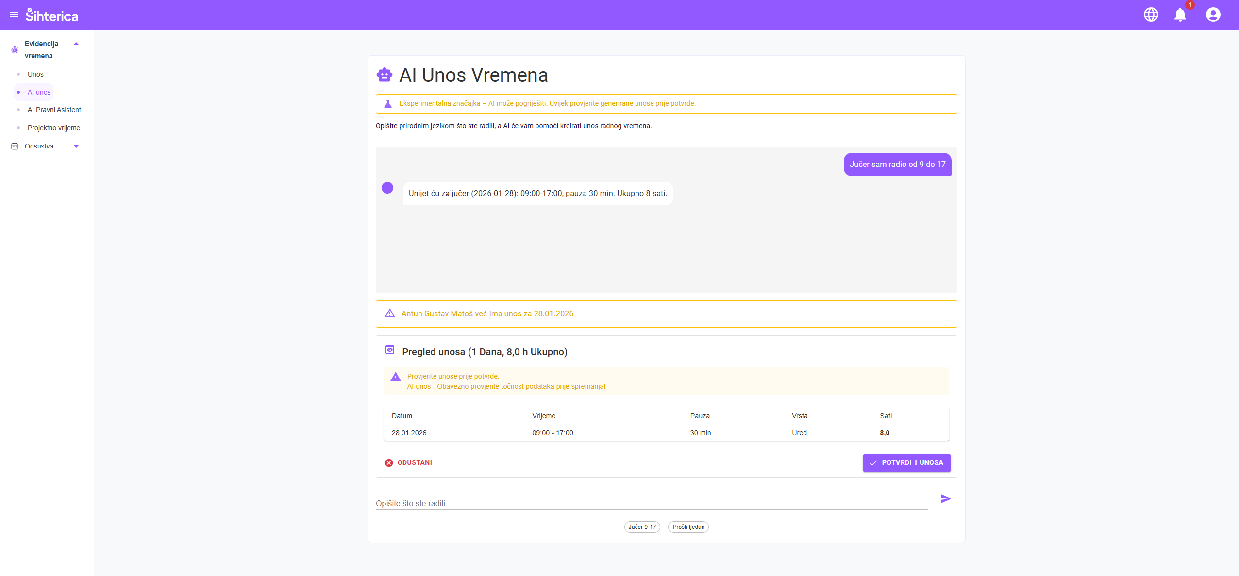 Zaboravite komplicirana sučelja! Jednostavno napišite prirodnim jezikom, npr. "Radio sam od 8 do 16 s pauzom od pola sata" – naš AI će automatski prepoznati i unijeti podatke umjesto vas.