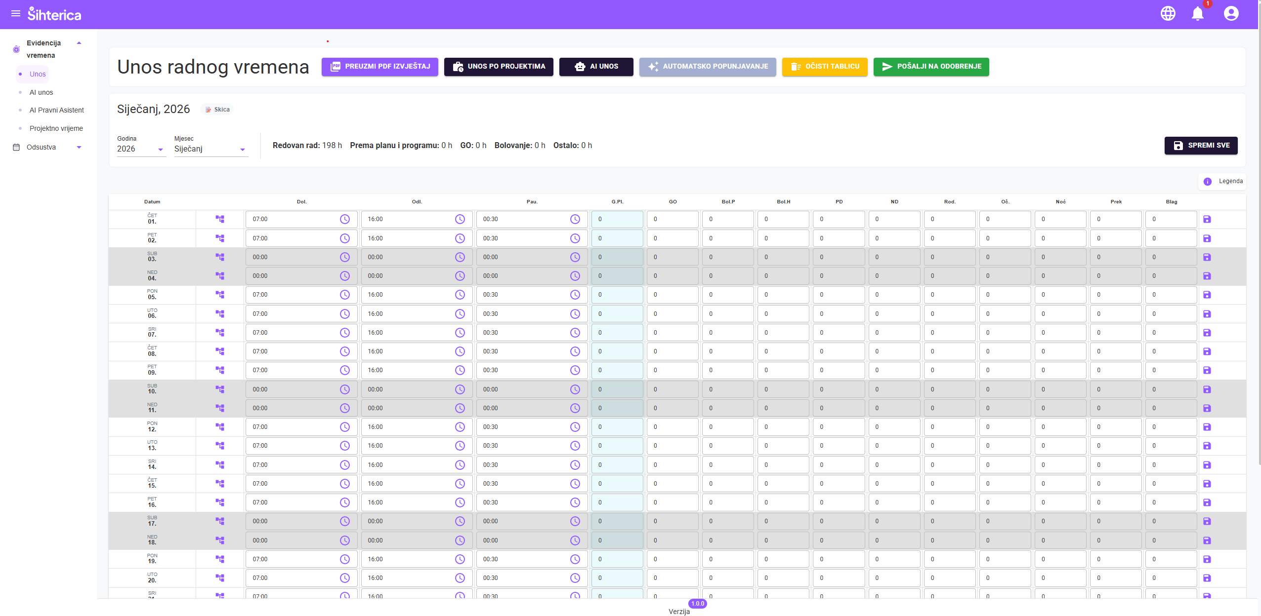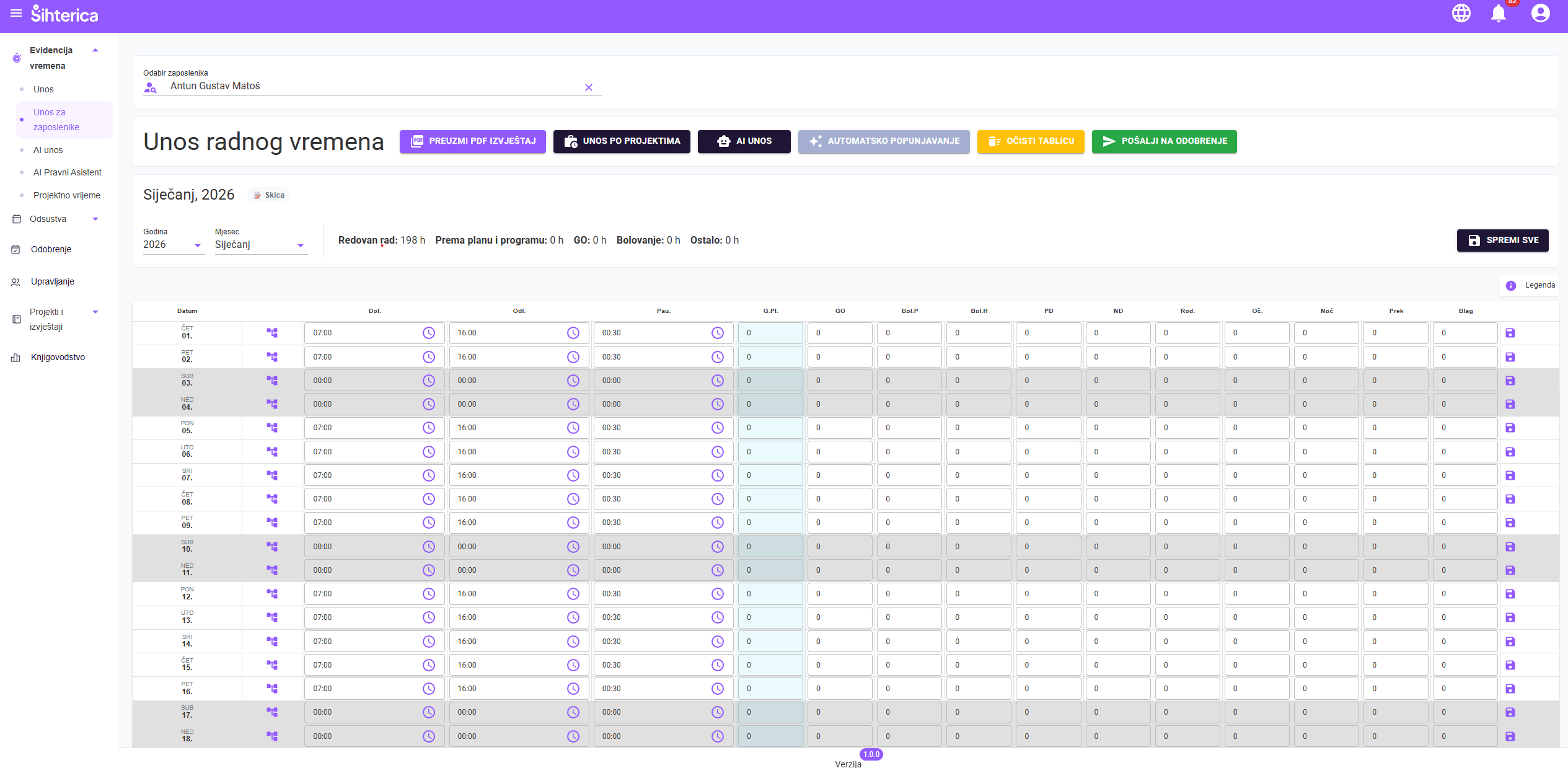 Na profilu postavite svoje zadano radno vrijeme (npr. 8:00-16:00). Sustav će na početku svakog mjeseca automatski popuniti cijeli mjesec s vašim standardnim satima – vi samo provjerite i pošaljite na odobravanje!