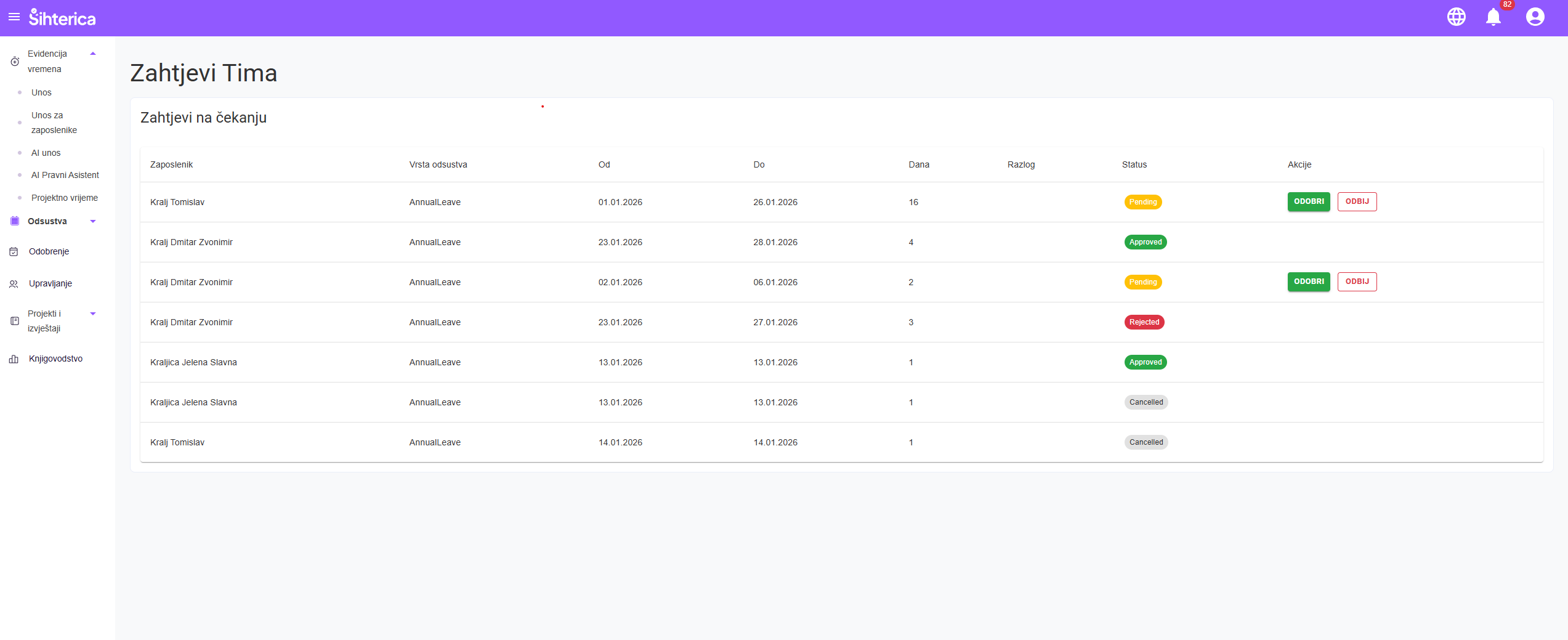 Sve prijave godišnjih odmora, bolovanja i drugih izostanaka na jednom mjestu. Pregledajte detalje, provjerite dostupnost tima i odobrite ili odbijte zahtjev s obrazloženjem.